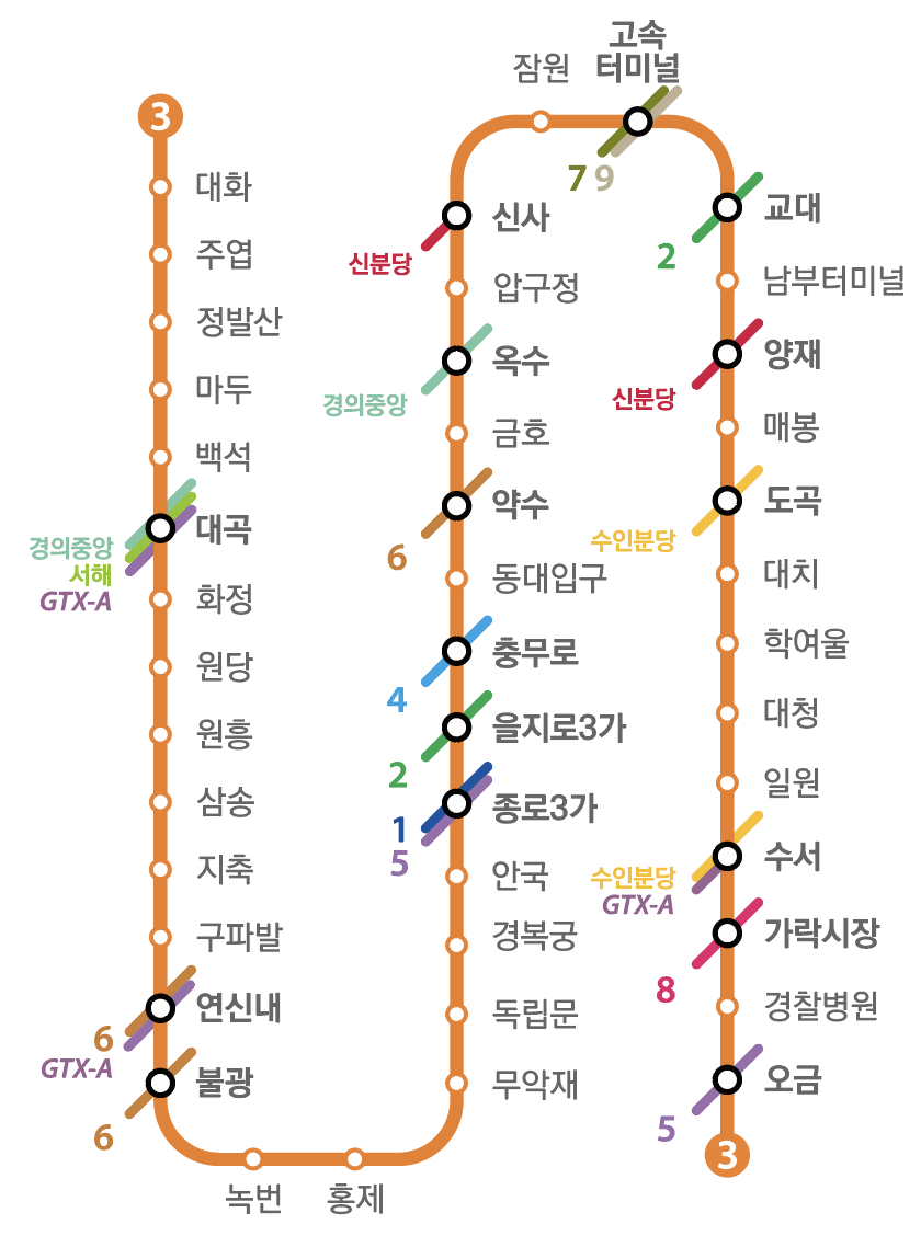 3호선은 서울 주요 노선들과 환승이 원활해 동선 짜기 최적화된 노선입니다.