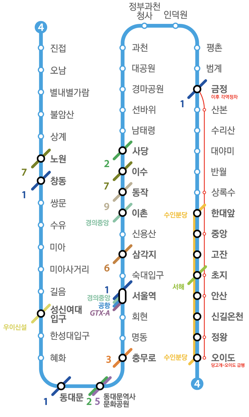 | 오이도 - 정왕 - 신길온천 - 안산 - 초지 - 고잔 - 중앙 - 한대앞 - 상록수 - 반월 - 대야미 - 수리산 - 산본 - 금정(1호선 환승) - 범계 - 평촌 - 인덕원 - 정부과천청사 - 과천 - 대공원 - 경마공원 - 선바위 - 사당(2호선 환승) - 이수(7호선 환승) - 동작 - 총신대입구 - 명동 - 충무로(3호선 환승) - 동대문역사문화공원(2·5호선 환승) - 혜화 - 한성대입구 - 성신여대입구 - 길음 - 미아사거리 - 미아 - 수유 - 쌍문 - 창동 - 노원(7호선 환승) - 상계 - 당고개 |