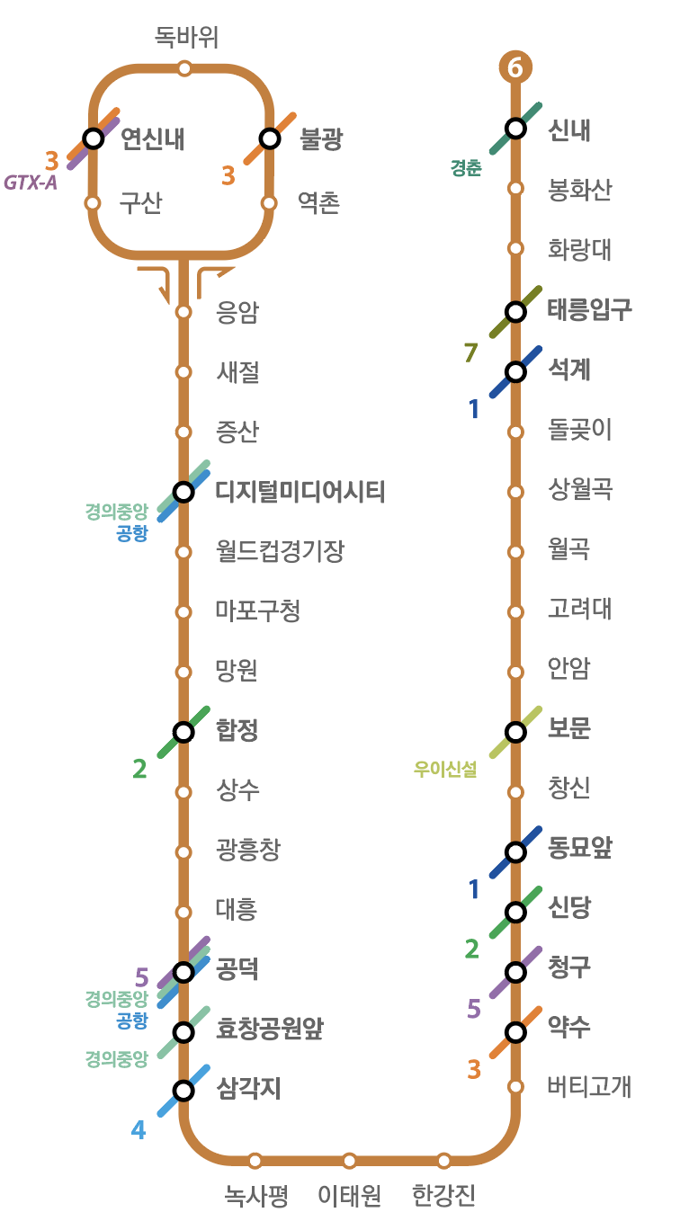 6호선은 총 9개의 환승 노선과 연결되며, 실질적인 생활권 이동에 유리한 노선입니다.