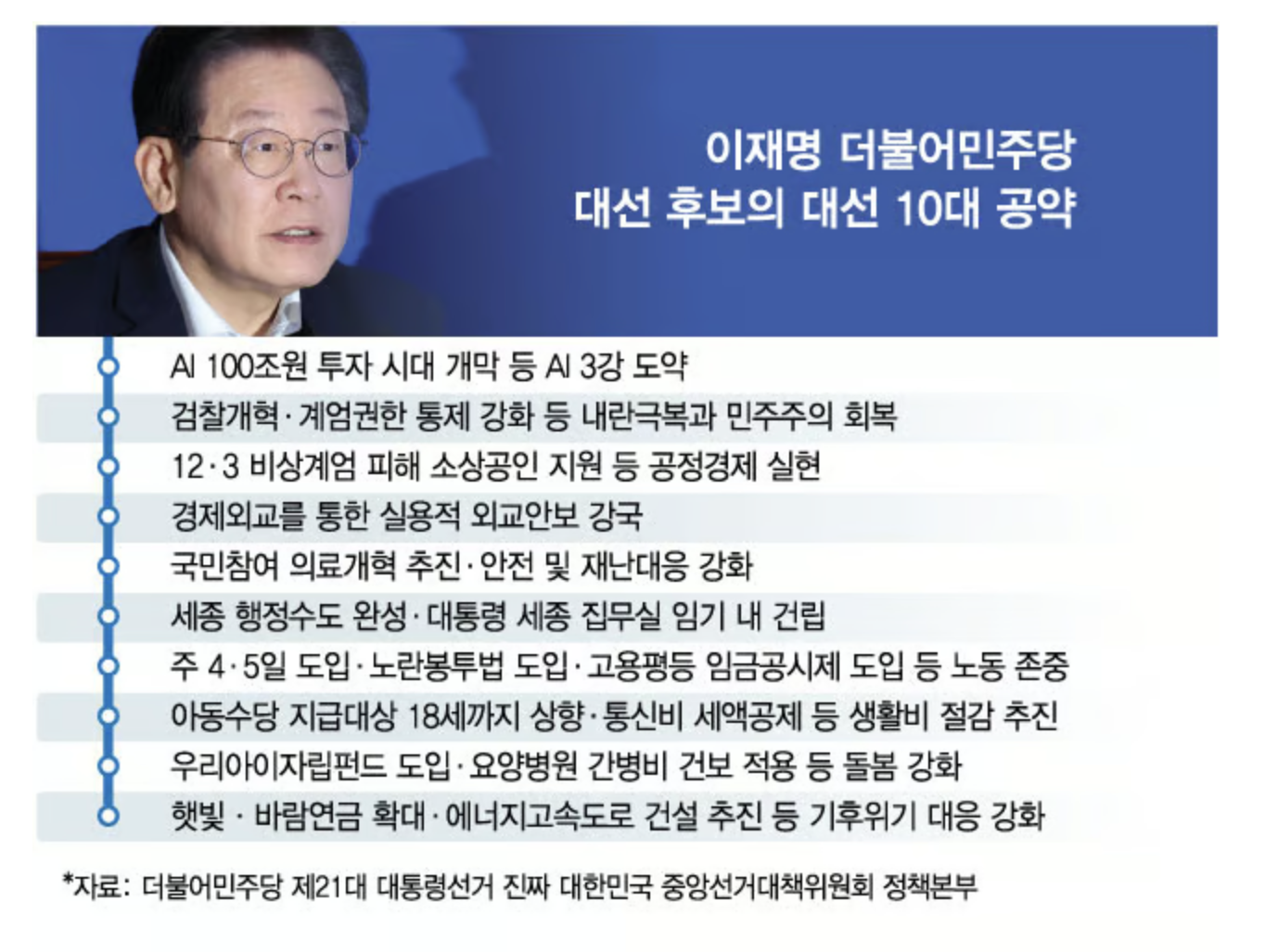 오늘은 제21대 대통령선거를 앞두고 이재명 더불어민주당 후보가 발표한 공약을 한눈에 보기 쉽게 정리해 드릴게요.
